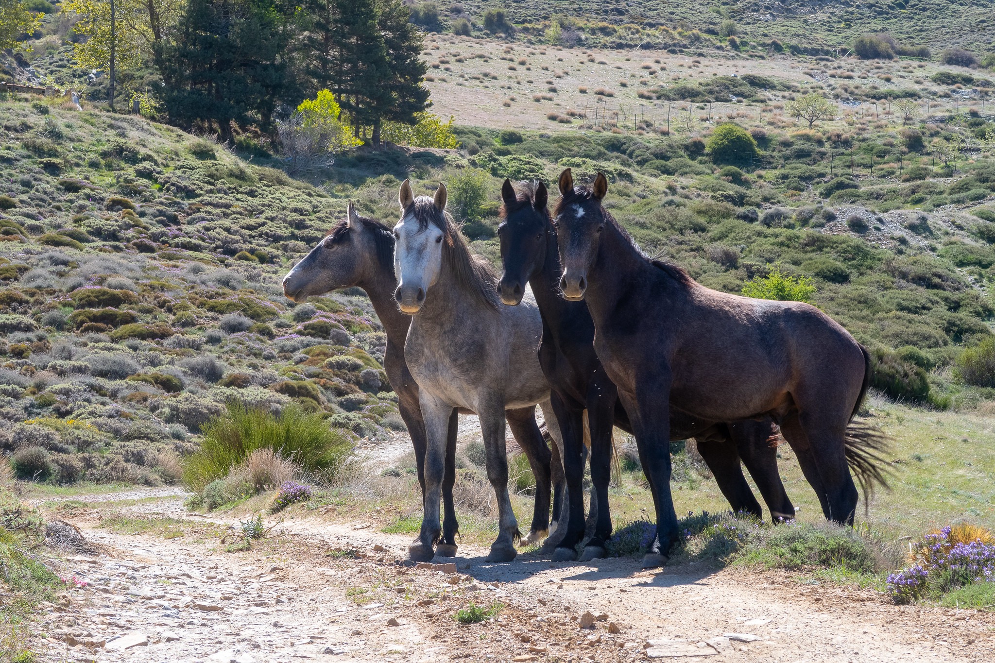 Dan zijn de levada’s ten einde en is de grindweg de realiteit. Heet, stijgend, in de zon. Het uitzicht is prachtig: had ik al verteld dat we de zee kunnen zien vanaf de berg? We lopen nu naar het oosten, en steeds is daar aan onze rechterhand de middellandse zee. Met een verrekijker kun je de badplaatsen zien liggen, terwijl wij hier 500 jaar terug zijn, tussen de restanten van door Arabieren aangelegde landschappen. Moerbeien, aardappels (!) aardbeien waren onder andere de gewassen. Moerbeien voor de zijdeteelt: in de 20 jaren van de vorige eeuw sliepen mensen soms nog buiten, terwijl de rupsen zich tegoed deden aan de bladeren die in hun huizen uitgespreid waren (Trevelez, maar daar zijn we nog niet!). Cadeautje is wel: wilde paarden op ons pad: te gek!